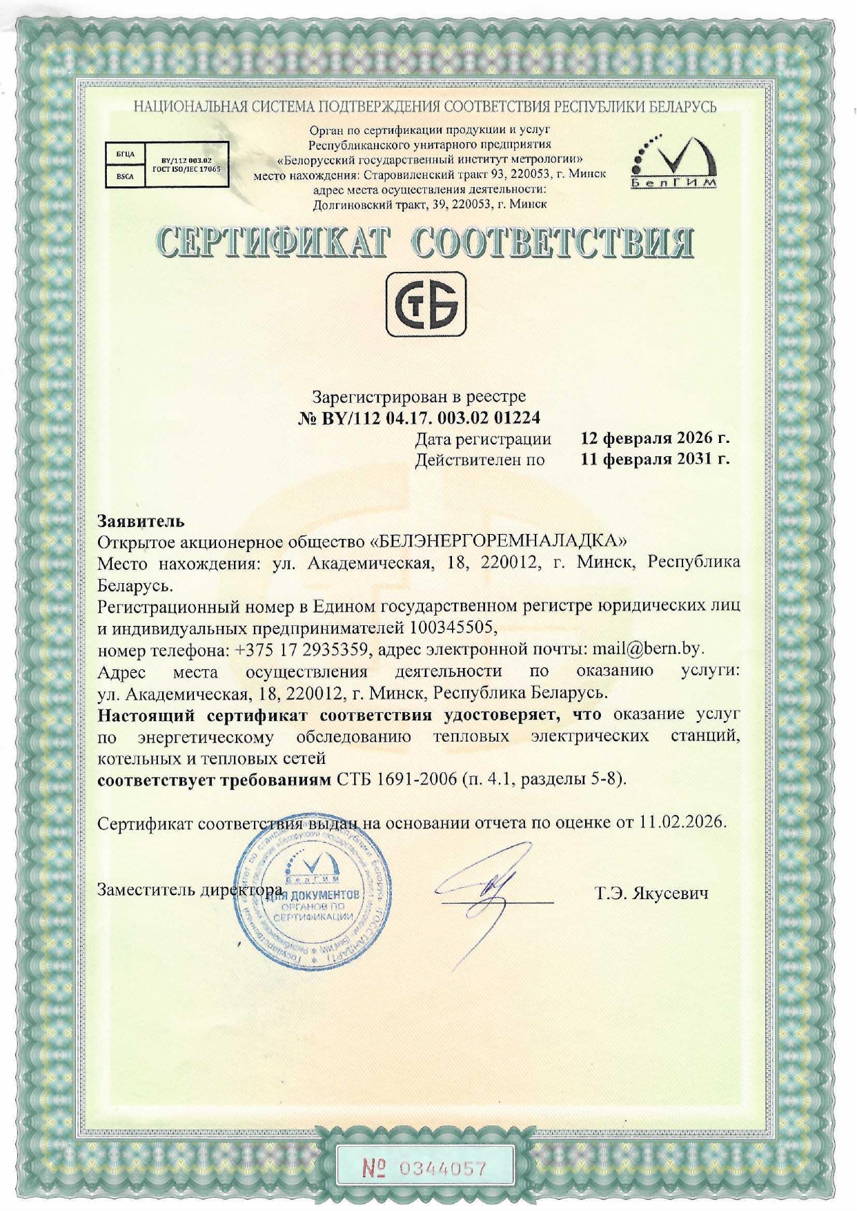 Сертификат соответствия на право предоставления услуг по энергетическому обследованию тепловых электрических станций, котельных и тепловых сетей (РУП БелГИМ)